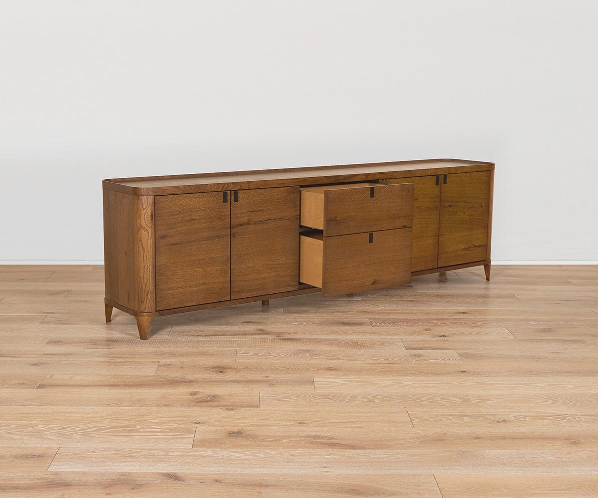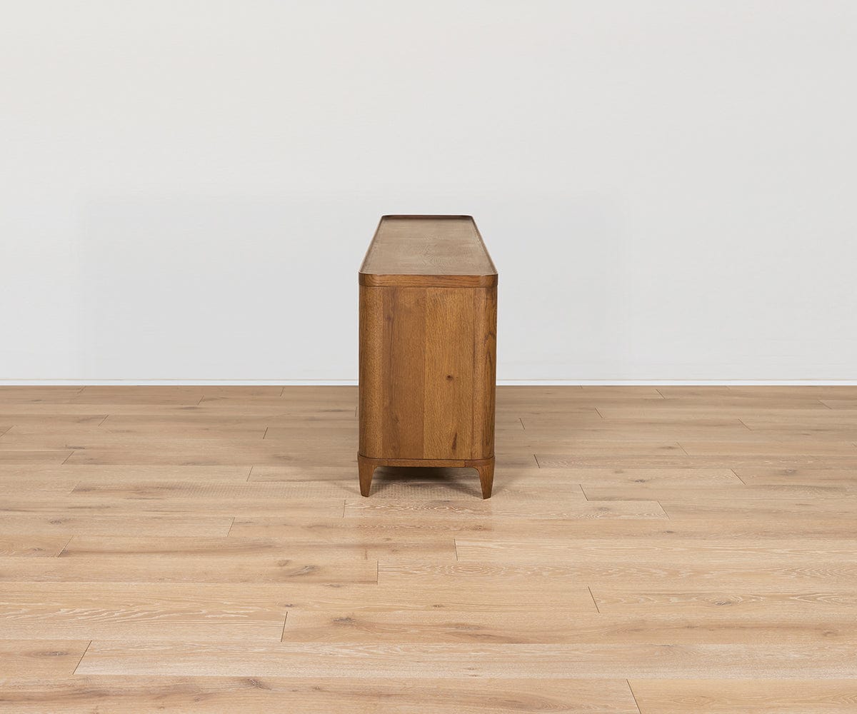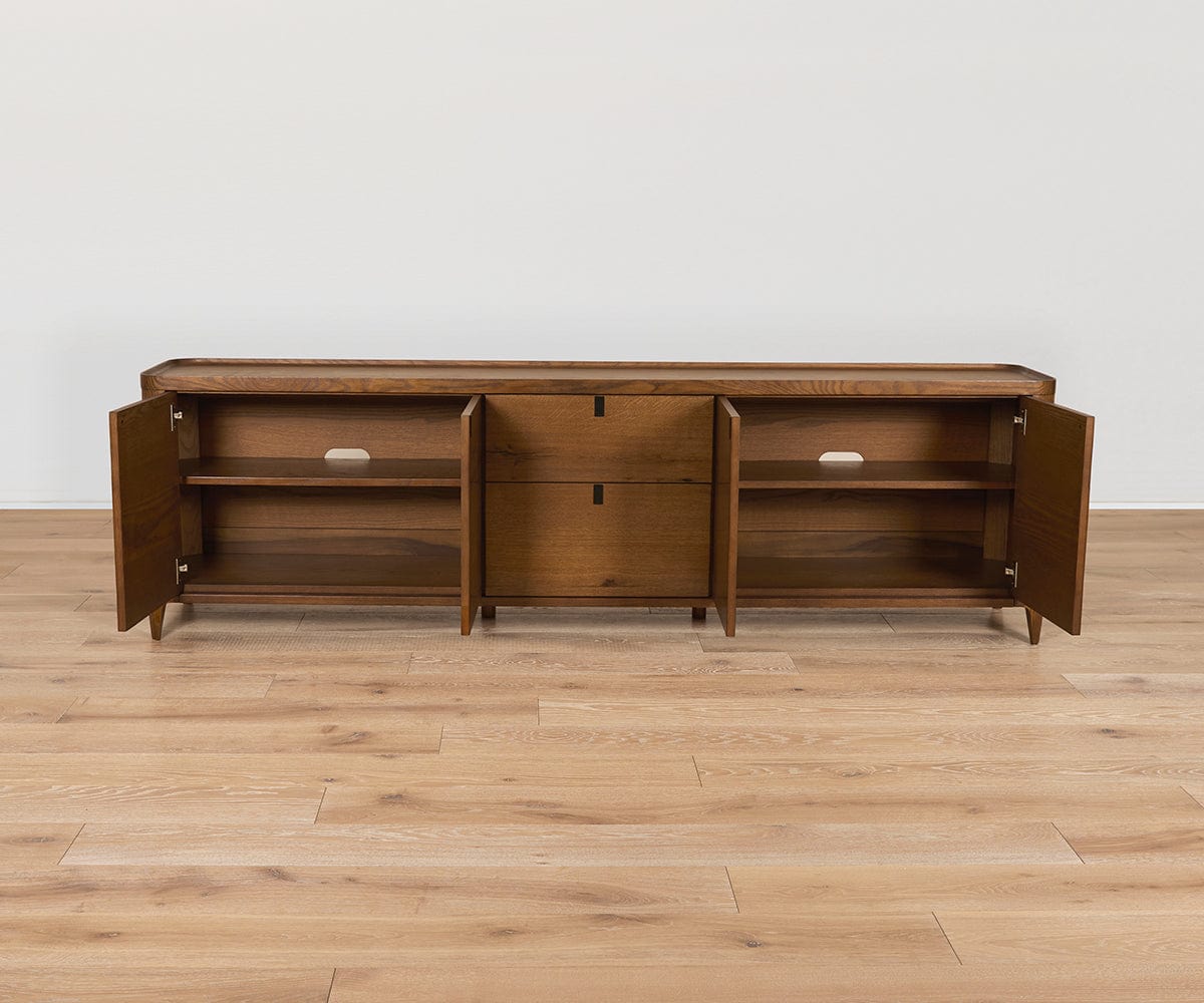 Fabriqué en chêne massif avec une belle finition foncée, le meuble multimédia Aden, de style milieu du siècle, présente un design polyvalent aux bords arrondis pour une allure plus douce et épurée. Parmi les autres caractéristiques, citons des poignées de tiroir qui s'ouvrent et se ferment pour un profil minimaliste, un rebord unique sur le bord supérieur et des tiroirs et portes à fermeture amortie pour protéger les doigts et le contenu. Associez-le aux autres pièces de la collection Aden pour créer un ensemble élégant et complémentaire.