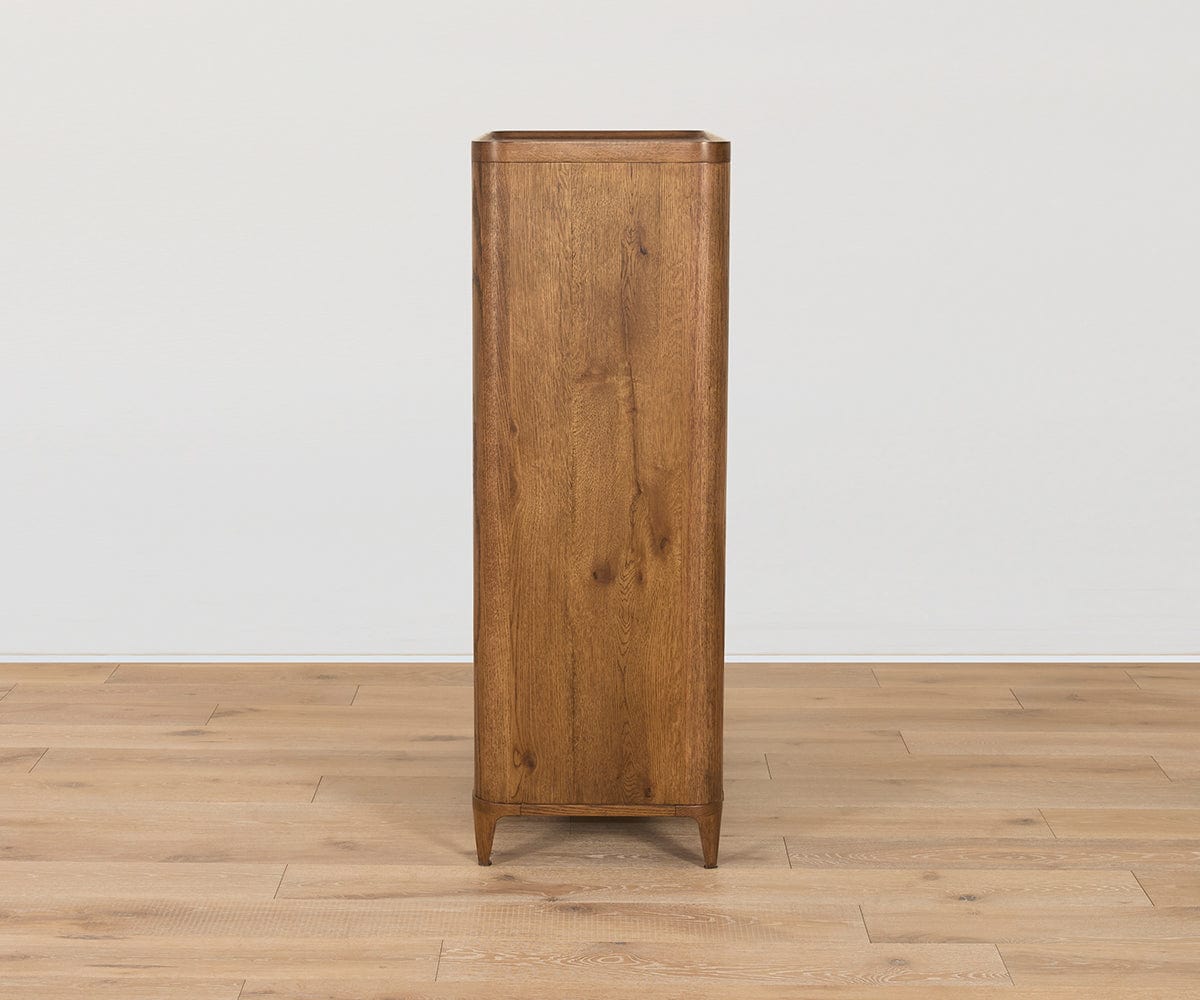 Fabriquée en chêne massif avec une belle finition foncée, la commode haute Aden, datant du milieu du siècle, présente un design polyvalent aux bords arrondis pour une allure plus douce et épurée. Parmi ses autres atouts, on compte des poignées de tiroir qui s'ouvrent et se ferment pour un profil minimaliste, un rebord unique sur le bord supérieur, ainsi que des tiroirs et portes à fermeture amortie pour protéger les doigts et le contenu. Associez-la aux autres pièces de la collection Aden pour créer un ensemble élégant et complémentaire.