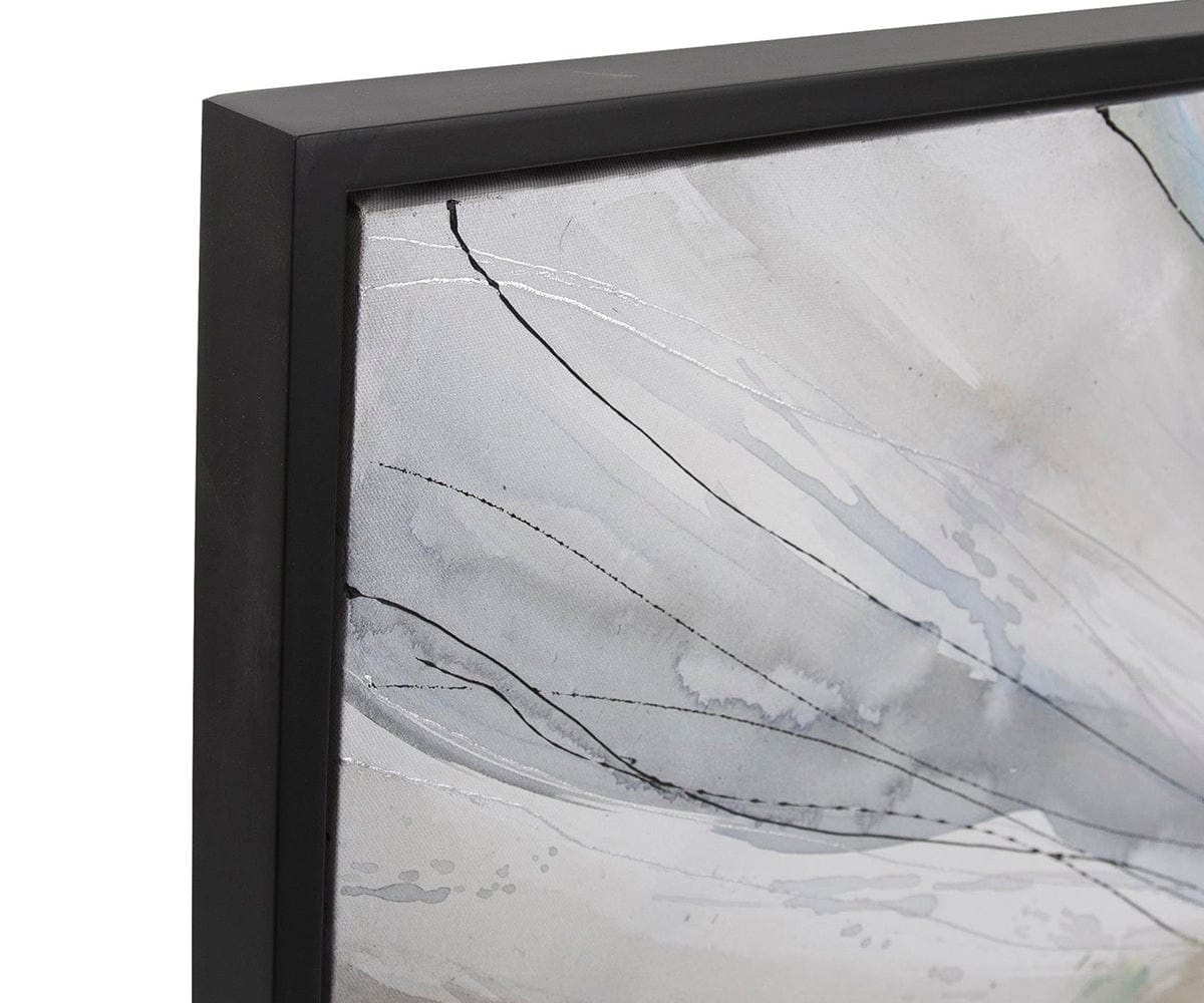 Plusieurs pots de peinture sont balancés sur une toile pour créer l'éblouissante éruption de couleur, une expression abstraite de mouvement accentuée de touches de feuille d'or pour plus de fluidité et de profondeur.