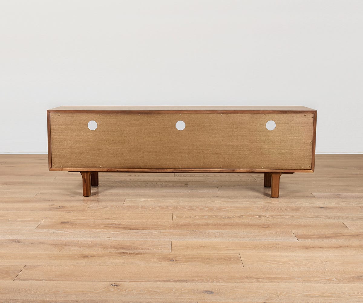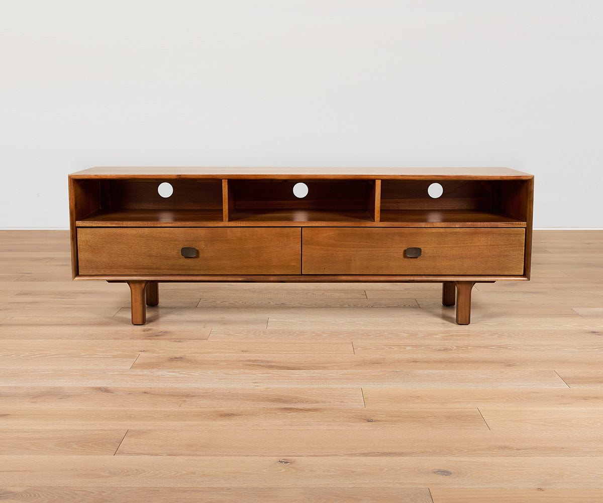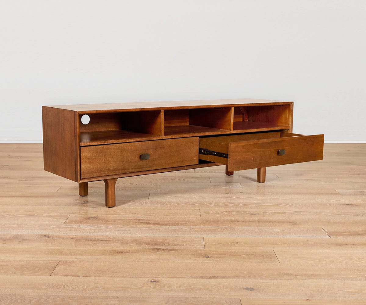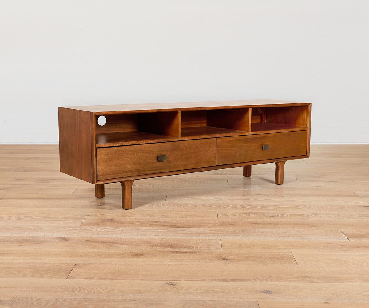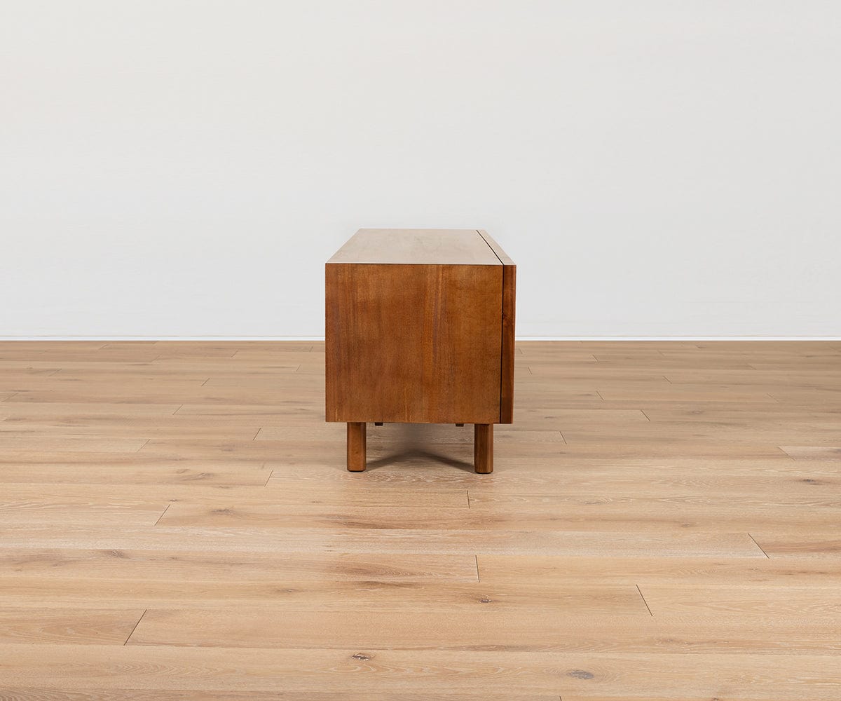 Le meuble multimédia Leevi revisite un style classique du milieu du siècle et ajoute une touche d'originalité à votre salon. Fabriqué en bois d'acacia massif, il présente une belle finition, des poignées de tiroir en laiton vieilli et une silhouette unique, le tout à un prix exceptionnel. Associez-le aux autres pièces de la collection Leevi pour créer un ensemble élégant et complémentaire.